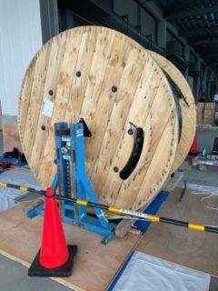 新築建物の幹線、既存建物幹線の高圧ケーブル・低圧ケーブルと当社では現在に至るまでに総重量数百トンものケーブル延線をしてきました。幹線となるケーブルなので途中で切断をすることがあまりありません。左側にある写真のケーブルドラムは総重量が3tにもなり長さは600mになります。道工具も当社自前で多数所有していますが状況に応じて一部レンタル品なども活用して対応にあたっています。